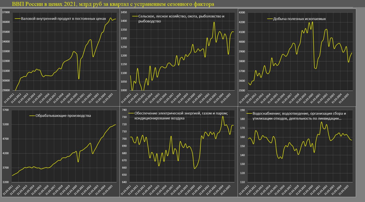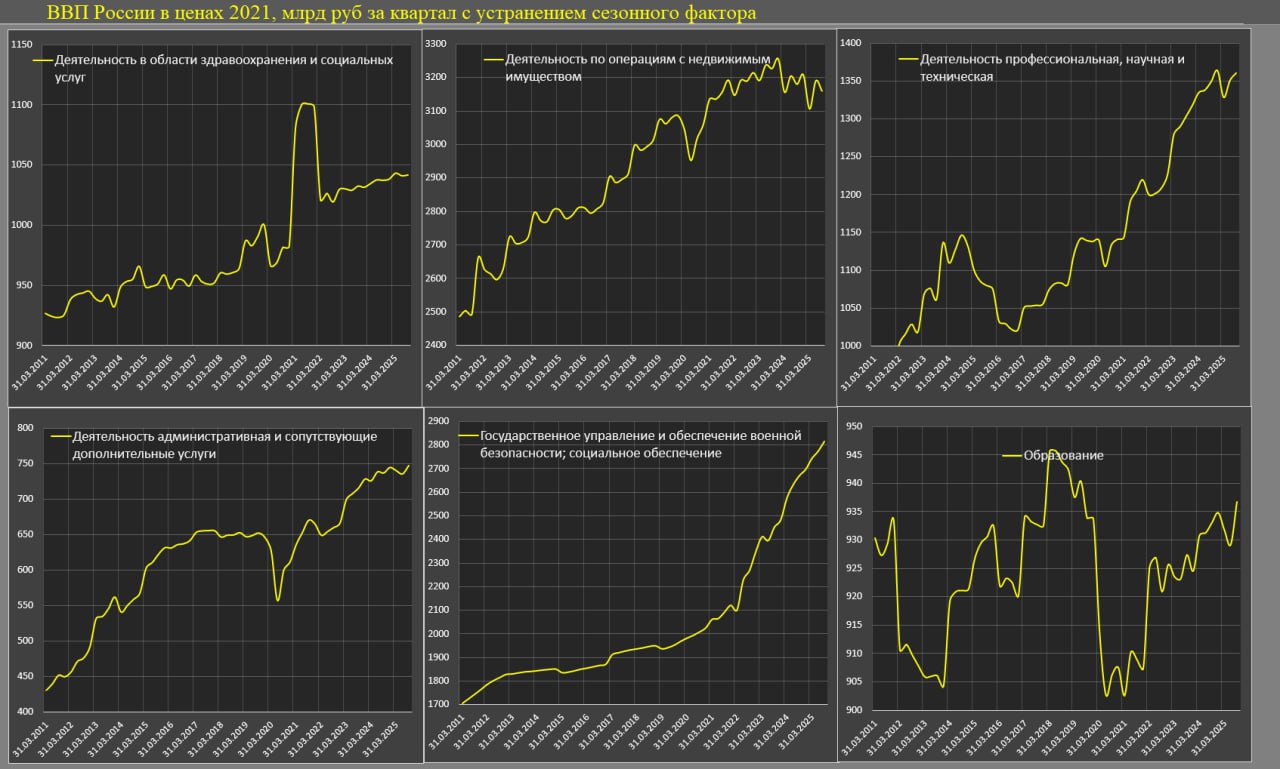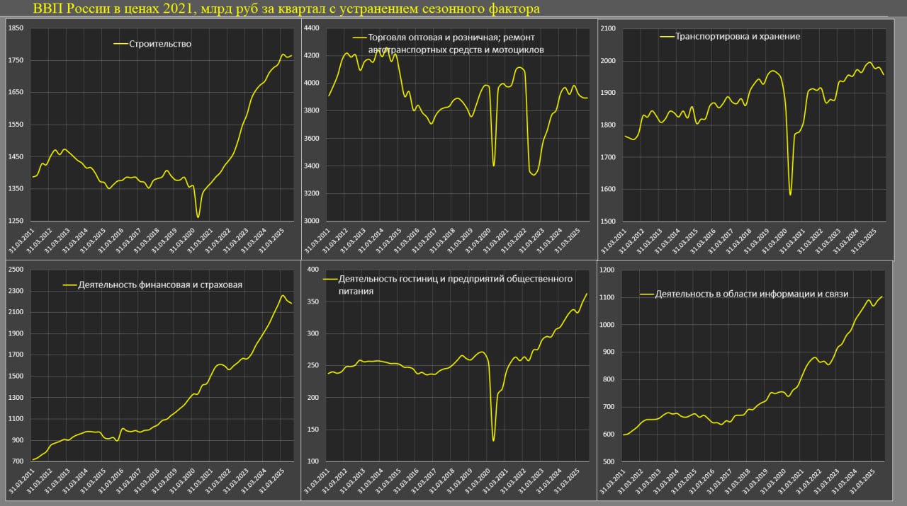 С 3кв22 по 4кв24 среднеквартальный рост финансов, строительства и ИТ составлял 2.5% (это свыше 10% в год!), а с начала 2025 около нуля.