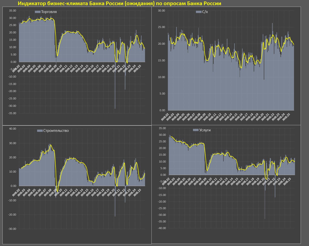 В текущем макроцикле минимум был в мае 2025 – 8.95п, а 6м средняя на минимуме была 9.46п в конце лета, т.е. по историческим меркам оптимизм достаточно высокий, по крайней мере, в постсанкционной реальности (2015-2025).