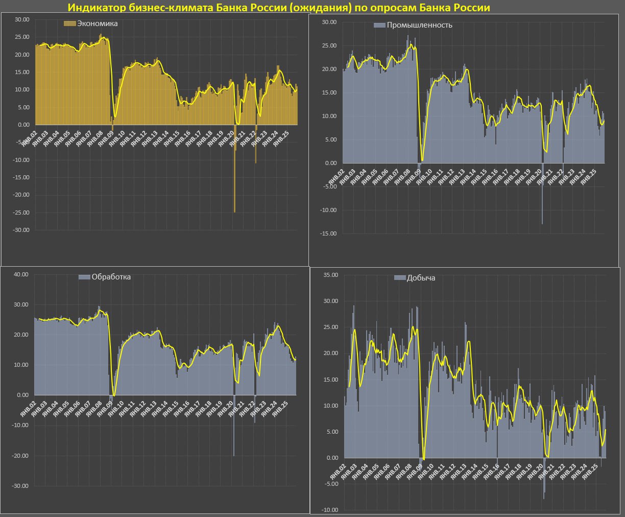 С июля происходит стабилизация в промышленности, возвращаясь на уровни начала года после резкого и мощного обвала в середине 2025, но даже с восстановлением ситуация очень слабая – характеризируется унынием в ретроспективном анализе (минимум с осени 2022 и соответствует средним показателям рецессии 2015-2016).
