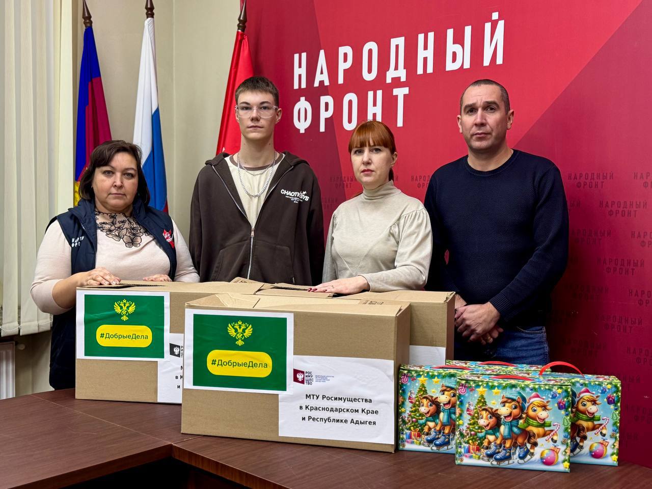 Сотрудники МТУ Росимущества в Краснодарском крае и Республике Адыгея передали Общероссийскому общественному движению «НАРОДНЫЙ ФРОНТ» гуманитарную помощь в преддверии новогодних праздников.