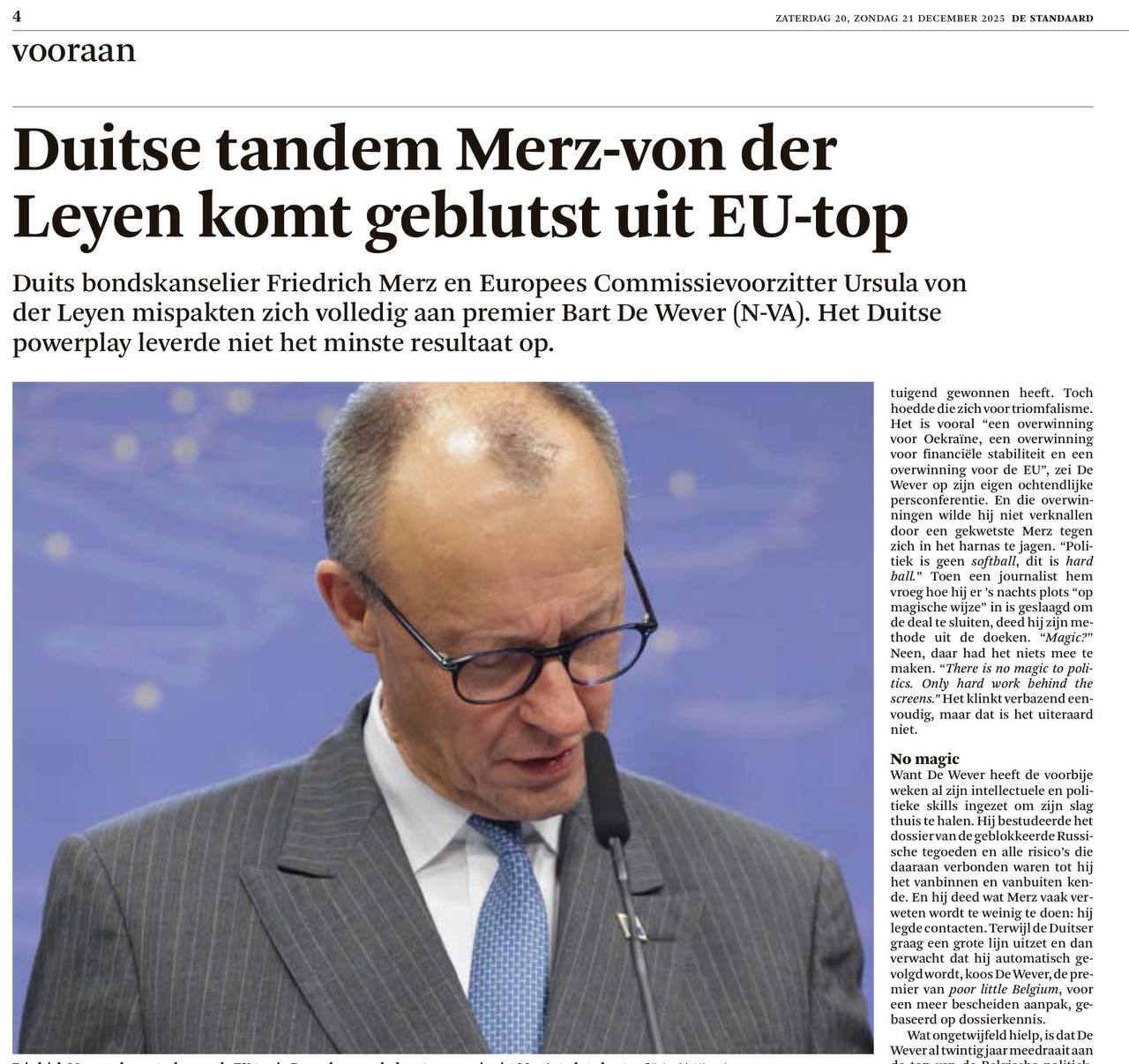 «Германский тандем Мерц - фон дер Ляйен вышел с саммита ЕС с синяками». Это оценка бельгийской газеты De Standaard. Пресса Бельгии отмечает победу своего премьера Барта де Вевера, чья схема сработала. Но делает это очень осторожно...