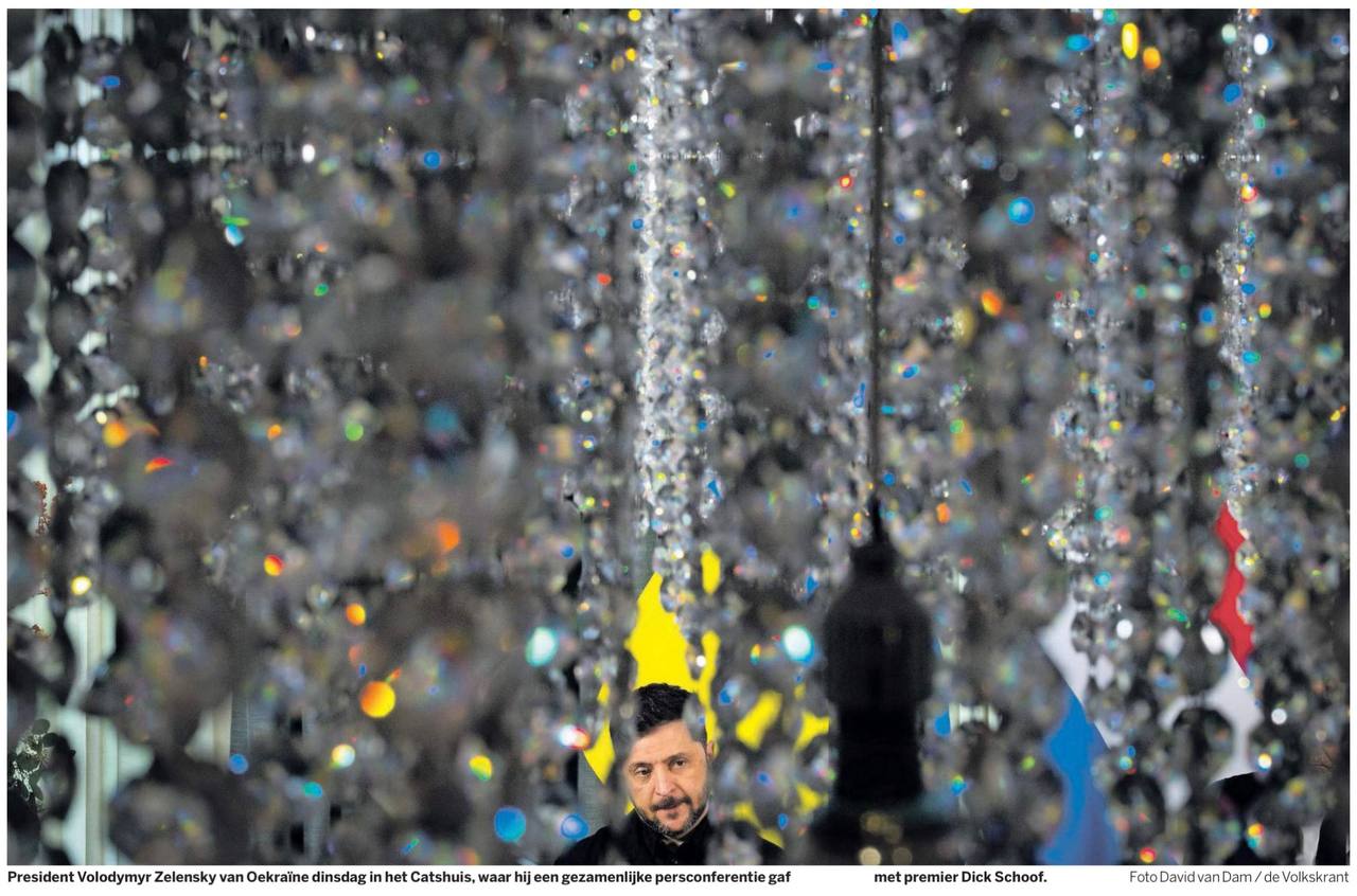 Клоуна под елочку заказывали? Это фотография со вчерашней пресс-конференции Зеленского в Гааге, опубликованная сегодня в газете De Volkskrant. Затерялся как-то заезжий комик среди рождественской мишуры.