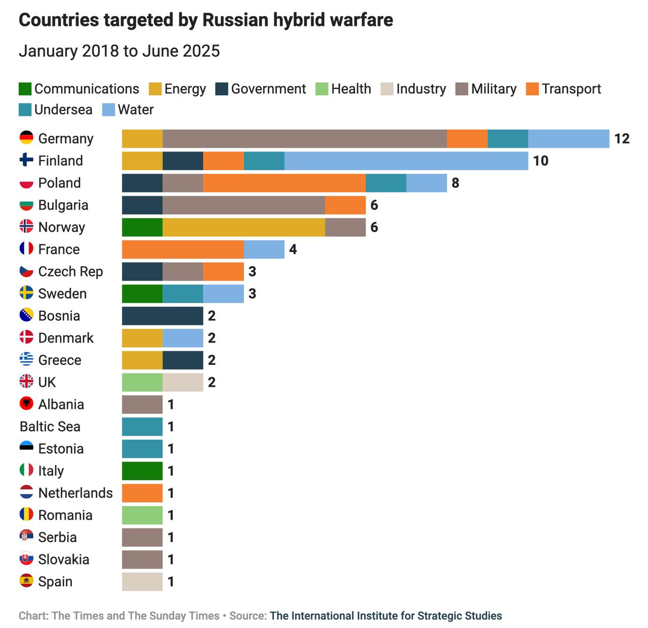 «Гибридные атаки, которые Россия совершила с января 2018 по июнь 2025 г. в Европе». Такой таблицей снабжает сегодня статью Марка Галеотти The Sunday Times. Статья называется соответствующим образом: «Путин смеется, когда у вас отключается Wi-Fi: он ведет войну раздражения».